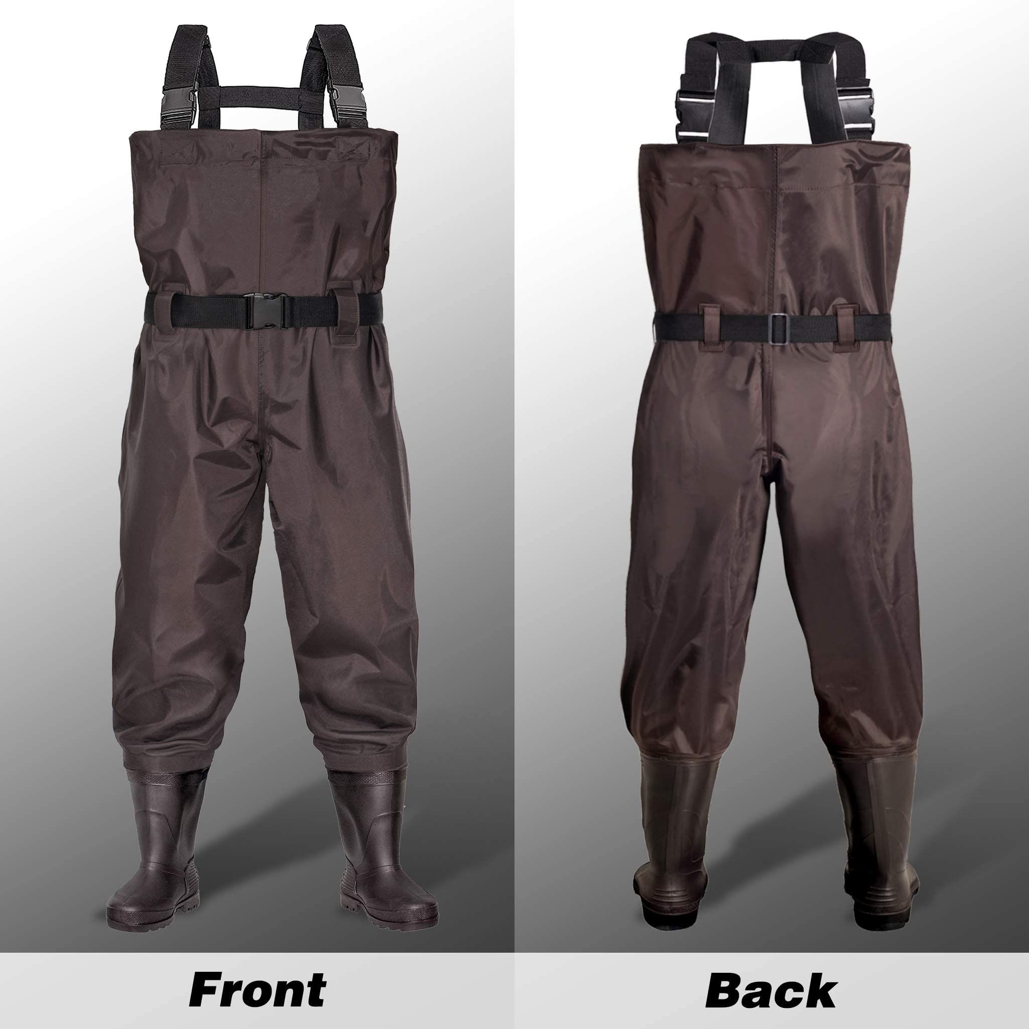 1.Color&Size: BELLE DURA Fishing waders have brown color and green, Both colors are perfect for men, women, youth, kids, boys and girls.PVC Boots with a standard size , waders with boots size 5 , Size 6, Size 7, Size 8, Size 9, Size 10, Size 11, Size 12, Size 13, Please choose your usual shoe size.If you have wide feet or need to wear thick socks, choose a size larger than usual.