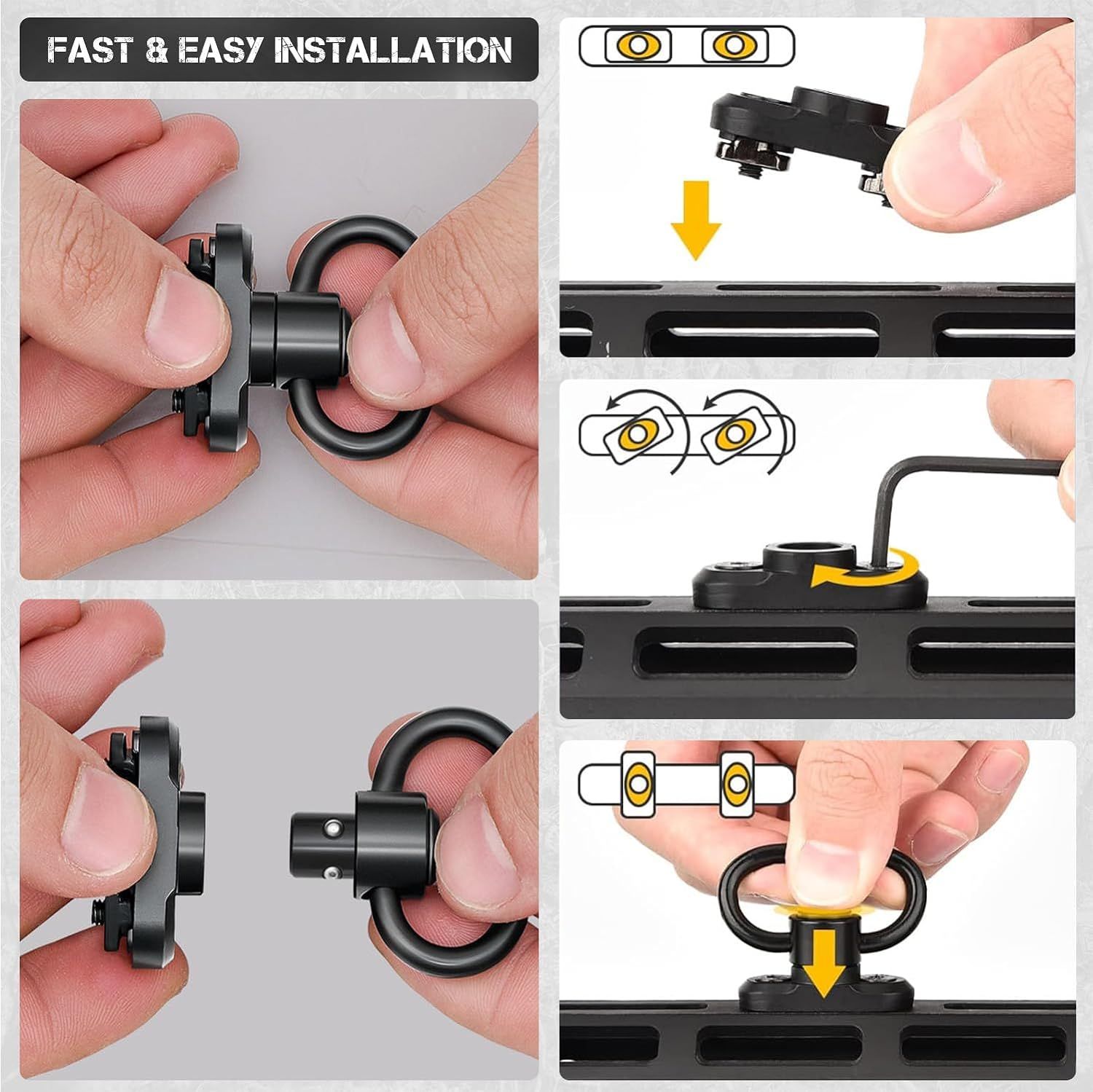 Lightning-Fast Adjustment: This two-point sling allows for rapid length adjustment through ''ONE BUCKLE'' simply pull up to release and pull down on the tab to tighten. Adapt swiftly to any combat scenario with lightning-fast adjustments, ensuring optimal weapon control. Effortlessly transition between shooting positions and achieve the perfect fit and comfort and stability. The sling swivels can be rotated 360 degrees. Press the button of the sling swivels for easy installation and removal.