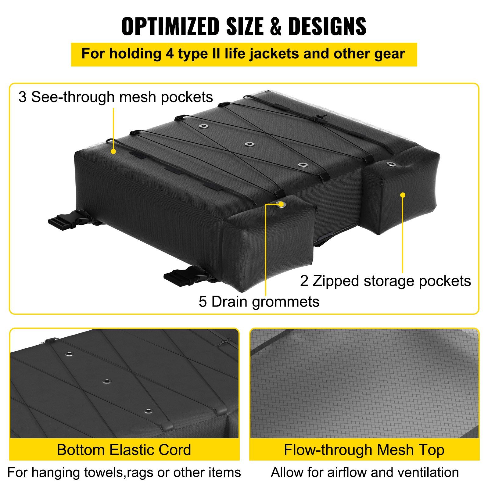 4.Extra Ample Storage Capacity: The main compartment with a nylon zipper can hold 4 life jackets, and a stretch cord across the bottom is for hanging towels, rain gear, or other items. Besides, the top of the storage bag is ventilated due to a nylon mesh for promoting airflow. The front side has 2 extra pockets and 3 mesh pockets for storing small items.